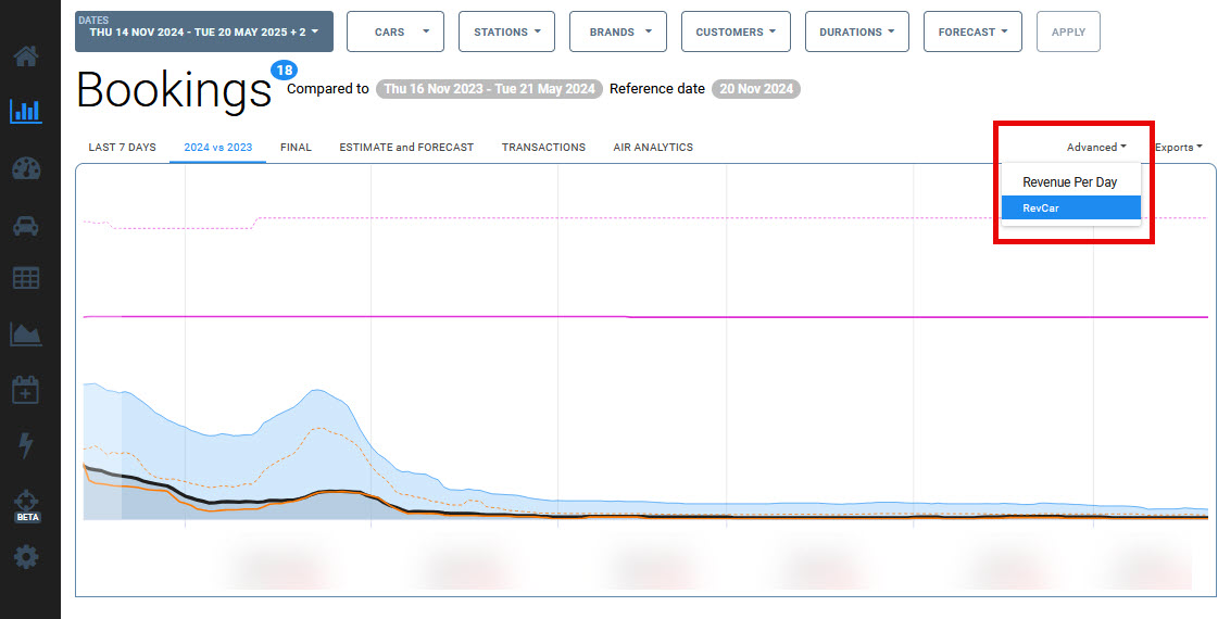 Se ha añadido un nuevo menú desplegable bajo la etiqueta "Avanzado", que permite seleccionar RevCar o Ingresos por día (RPD) como KPI.